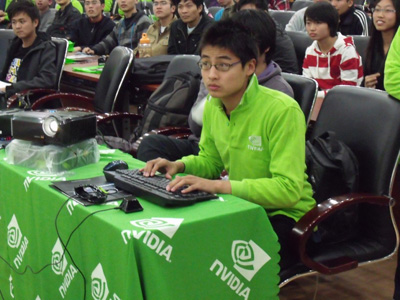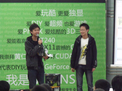 活动中所采用的游戏-抽奖-报告的形式则将玩和学结合在一起,让活动现场气氛十分活跃。随着活动的进行,由我院组织的“校园凡客体大赛”和“火箭车竞速大赛”中的获胜者也相继产生,在同学们的掌声中获得了由英伟达公司提供的丰厚奖品——NVidia图形加速卡GT240,将现场气氛推向了最高潮。