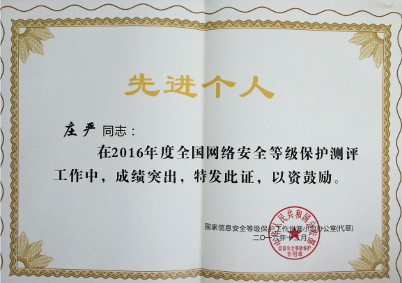 此次获奖是国家相关主管部门对我校信息安全测评中心2016年度测评工作、CNAS能力验证全国总分第三、以及测评系统数量和质量的充分肯定。信息安全测评中心庄严老师荣获“先进个人”称号。