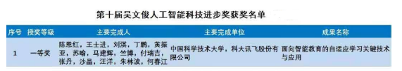 4月10日,我国智能科学技术领域重要奖项“吴文俊人工智能科学技术奖”十周年颁奖盛典在北京隆重举行,我院陈恩红教授团队联合科大讯飞股份有限公司共同完成的项目——“面向智能教育的自适应学习关键技术与应用”荣获吴文俊人工智能科技进步奖一等奖。