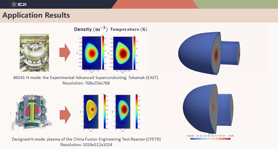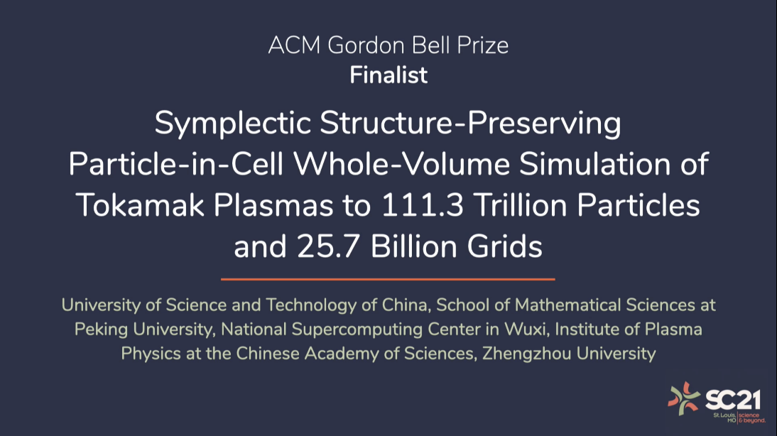当地时间11月16日下午,中国科大入围国际戈登•贝尔奖评选的超算应用成果 “Symplectic Structure-Preserving Particle-in-Cell Whole-Volume Simulation of Tokamak Plasmas to 111.3 Trillion Particles and 25.7 Billion Grids”,参加了在美国密苏里州圣路易斯召开的全球超级计算大会(SC21)的线上答辩,报告了中国科大在新一代神威超级计算机上首次实现EAST(先进实验超导托卡马克)和CFETR(中国聚变工程试验堆) “聚变堆全装置动理学等离子体演化模拟”,这是中国科大首次作为第一完成单位入围戈登•贝尔奖评选。戈登•贝尔奖是国际上高性能计算应用领域的最高学术奖项,被称为“超算领域的诺贝尔奖”,由ACM(美国计算机学会)每年评选和颁发,具有巨大的国际影响力。此前,在10月22日举办的CCF(中国计算机学会)高性能计算学术年会(HPC China 2021)上,该成果获得了2021年首届“年度中国高性能计算最佳应用奖”。此项成果由核科学技术学院肖建元副研究员课题组与beat365体育官方网站安虹教授课题组联合攻关,在中国科学院合肥物质研究院等离子体物理研究所、中国科学院数学与系统科学研究院、国家超级计算无锡中心、北京大学和郑州大学相关研究人员的紧密配合下完成。