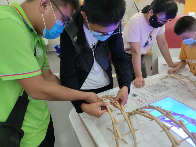 在力学展区,大家观看缓慢的气泡、滑坡竞赛、锥体上滚、正弦波曲线和非周期性砖块组等力学实验,惊叹于机器人画出“美妙的数学曲线”。同学们积极动手实验,胡潇逸和朱炜荣同学搭建木条拼搭的“虹桥”。