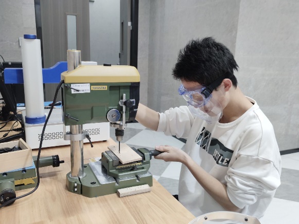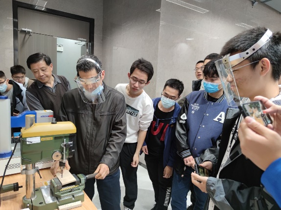 接着,在高级实验师王中平老师和崔峰老师的带领下,同学们依次参观光学实验室、电学实验室、创新加工实验室、焊接实验室和3D打印实验室等区域,王中平详细讲解各实验室基本情况和设备使用规范。在创新研讨室,做赛车机器人的高年级学长向班级同学讲解机器人制作和科技比赛等具体内容。