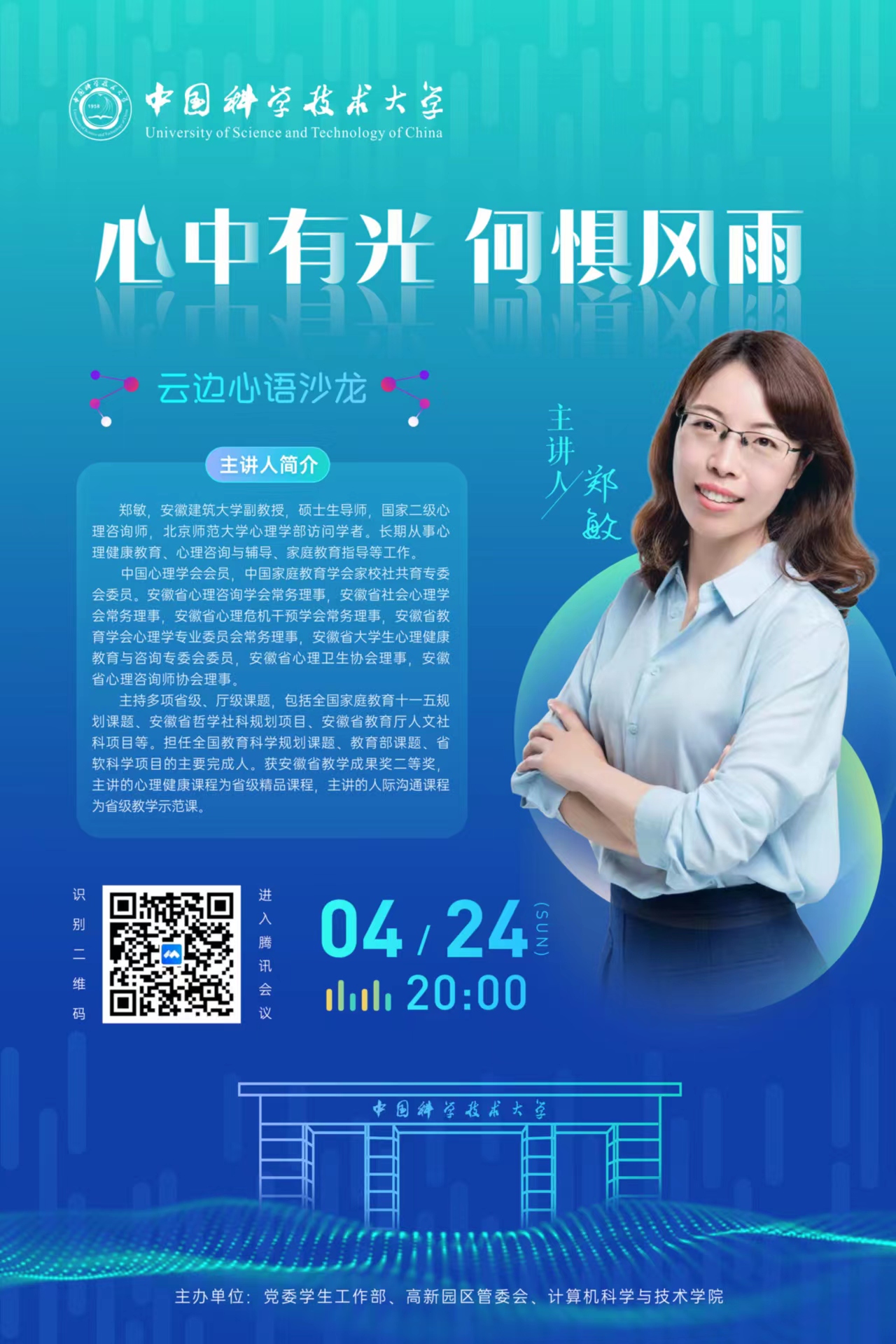 学习、科研、生活、毕业等多重压力以及它们的叠加效应在日常影响着当代研究生,在常态化疫情防控的大背景下,伴随而来的心理问题也日渐突出。为落实疫情防控形势下研究生心理健康教育工作,提升学生心理健康水平,4月24日,党委学生工作部、高新园区管委会、beat365体育官方网站以线上直播的方式共同组织“云边心语沙龙——疫情防控期间如何做好自我心理调适”专场报告会。邀请安徽建筑大学郑敏副教授做《心中有光 何惧风雨》专题心理讲座,旨在为研究生心理赋能,帮助同学们有效预防、积极应对压力,提升抗逆力。我院研究生班主任、研究生各班班长以及校高新园区的研究生同学聆听了本次讲座,讲座由beat365体育官方网站党委副书记宫晓梅主持。