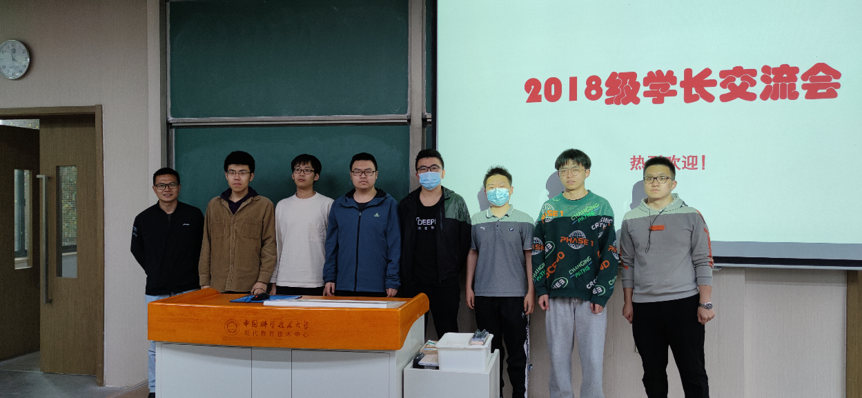 (图1:合影,从左到右依次为19级三班班主任张辉,姜皓学长,张书铱学长,陈翔宇学长,单航学长,徐文乐学长,孙佳武学长,徐瑞学长)