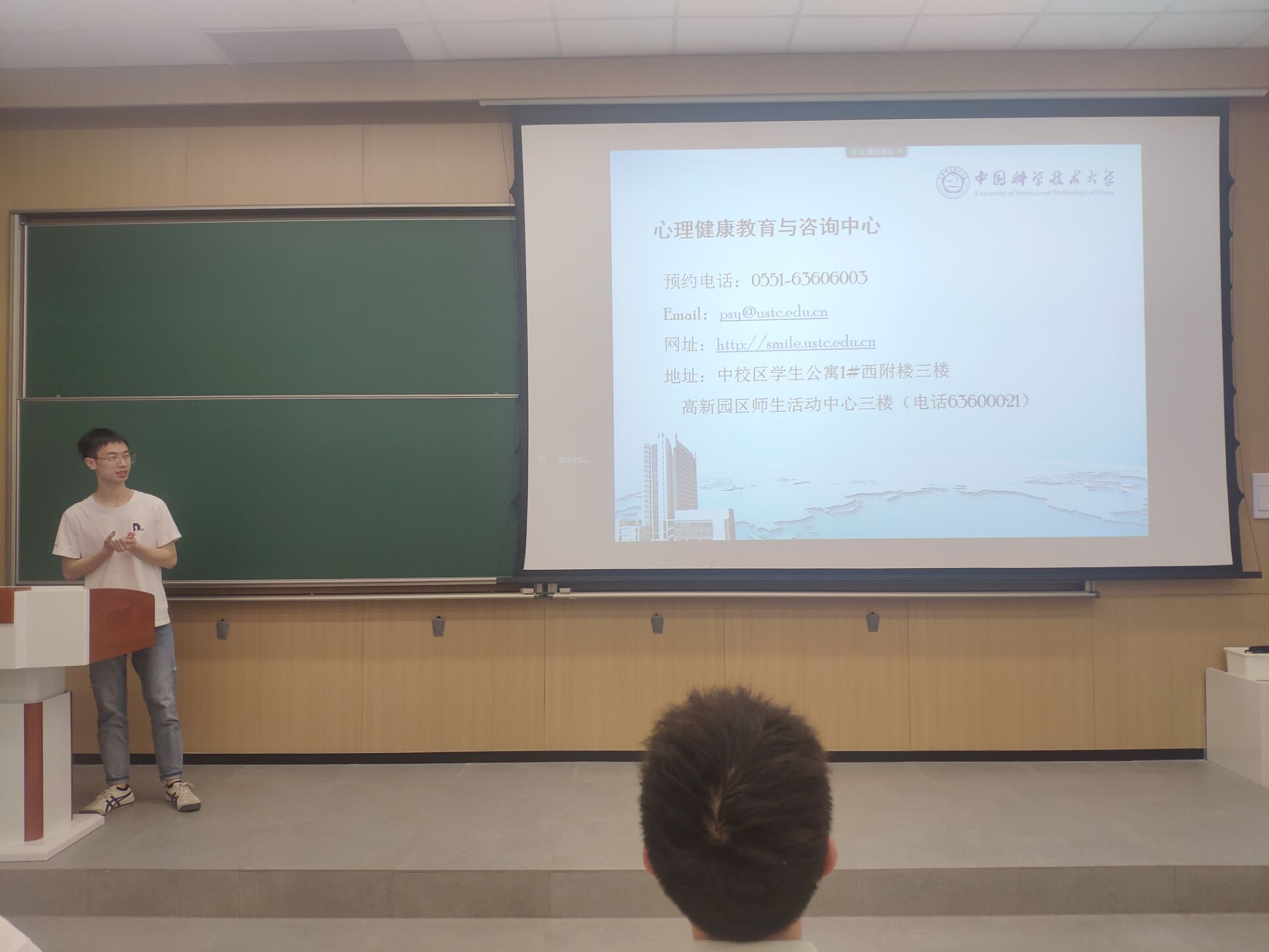 首先,心理委员徐宗浩向同学们介绍了学校心理健康教育与咨询中心的联系方式及现场咨询地址。鼓励当同学们心理压力较大无法排解时,主动向心理健康教育与咨询中心寻求帮助。