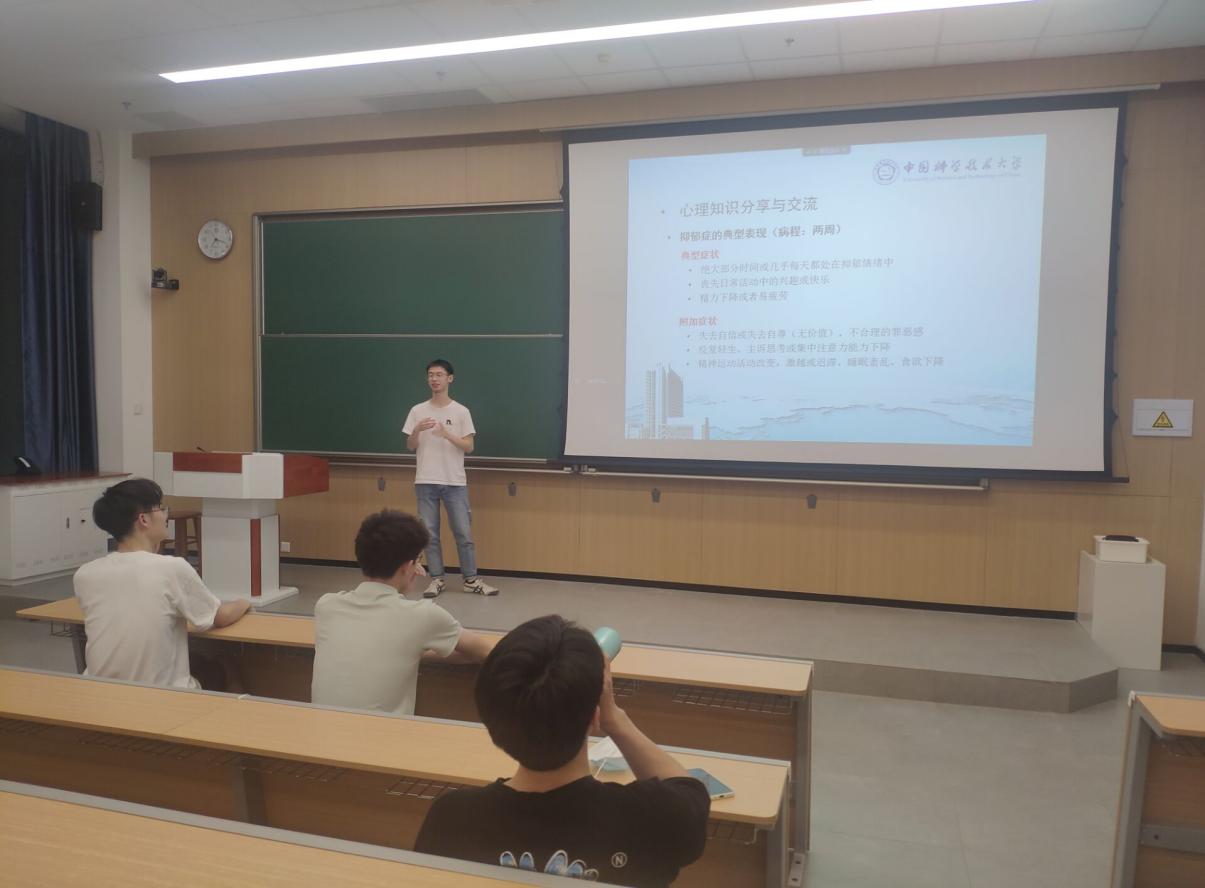 接下来,徐宗浩同学进行了心理知识分享与交流,介绍了朋辈心理辅导,抑郁情绪以及抑郁症相关的知识。