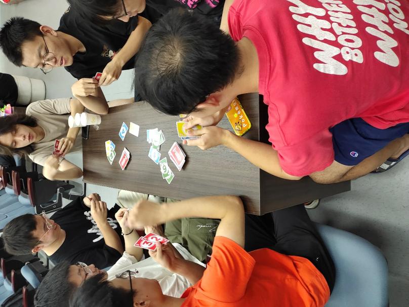 随后,班委王霄阳、庄严等同学布置好场地,拿出准备好的零食饮料和卡牌道具,引导同学们开展自由破冰交流活动。同学们有的在会场内聊天交流,有的自行分组参与掼蛋、UNO、阿瓦隆等破冰游戏,一同感受热闹团圆的节日气氛,在休闲的交流中放松身心、增进彼此了解。最后,在多样且有趣的互动过程中,本次活动接近尾声。