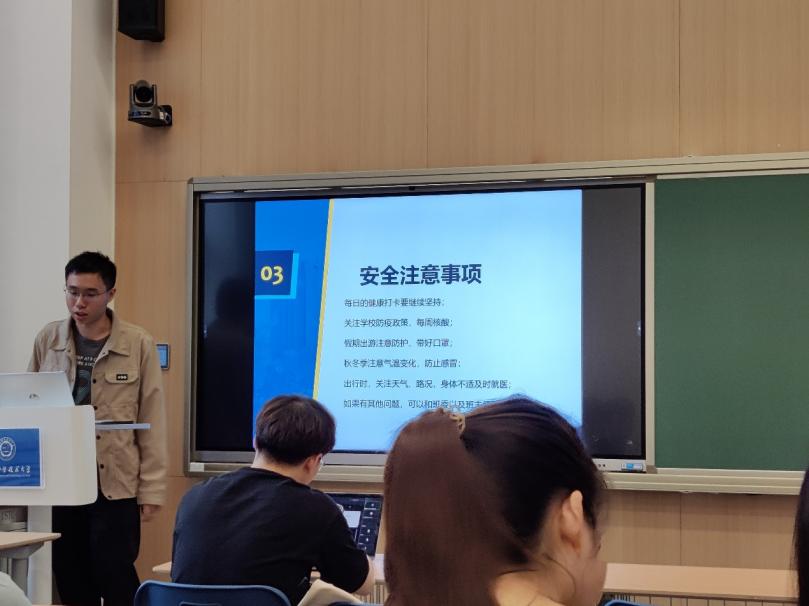 随后,考虑到国庆假期将至,班委们列举了部分安全注意事项,提醒大家假期注意安全,严格遵守疫情防控管理规定,谨慎应对天气变化。