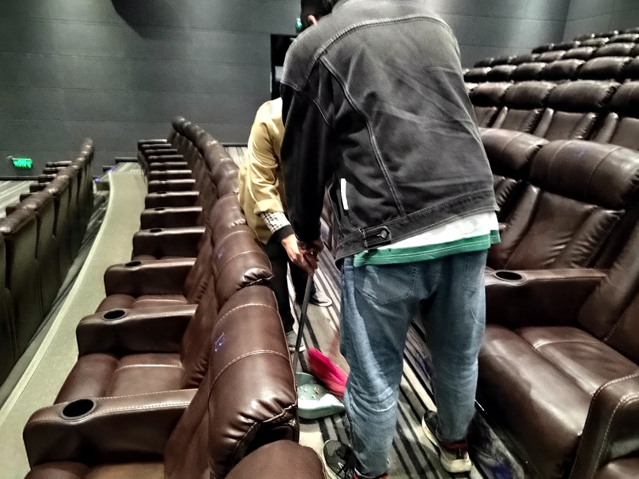 观影结束后,同学们主动把自己在黑暗中不小心弄脏的地板打扫干净,从小事着眼,做有担当的大学生。