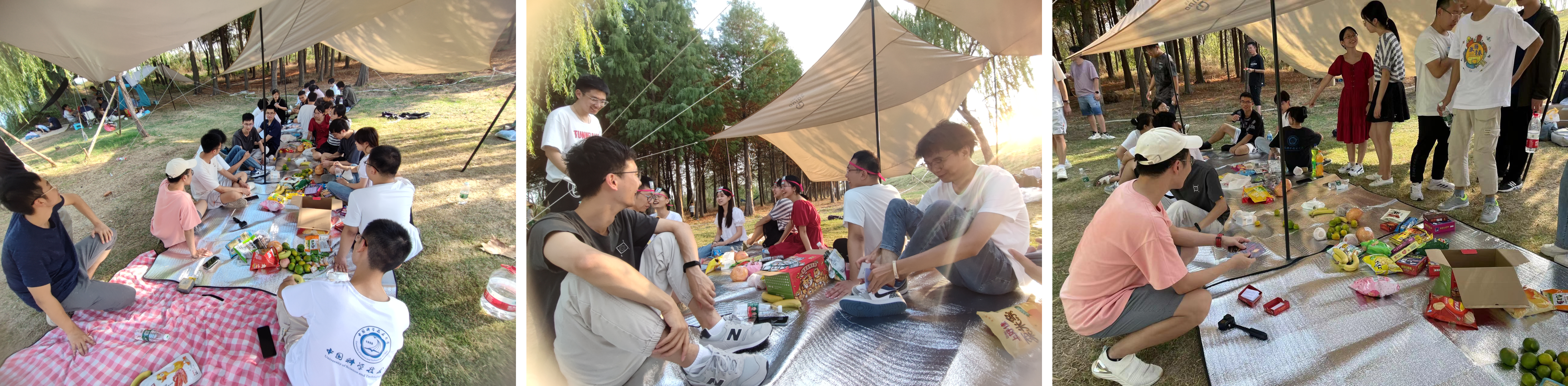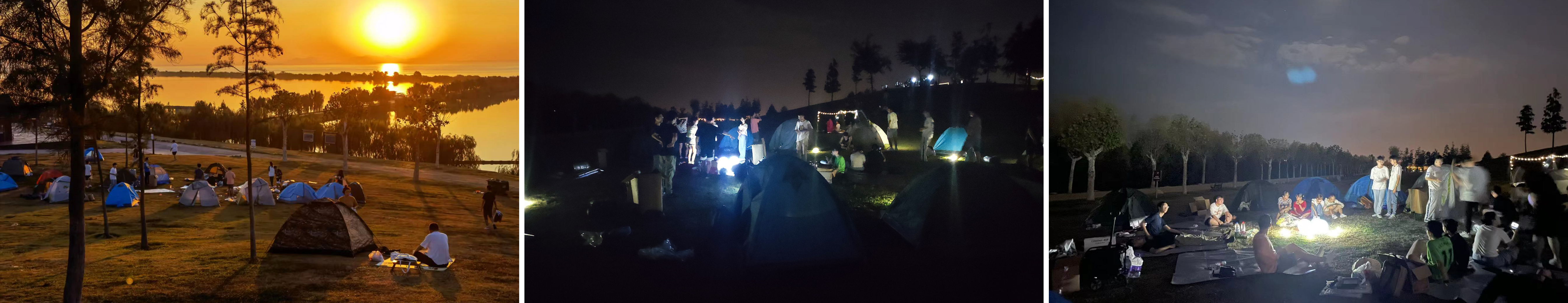 不知不觉间,太阳即将落山,大家聚到一起一边享受美好的晚餐时光,一边欣赏落日的余晖。晚餐后,同学们开始搭建帐篷,大家每两人一组,相互协作。在有搭建天幕经验的基础之上,十余顶帐篷很快成型。营地的灯光与月光相互辉映,显得格外温馨。营地搭设完成,大家又聚到一起开展破冰小游戏。踩气球、套圈圈等游戏,不仅考验了同学们间的默契,更增进了友谊。在一片欢声笑语中,破冰游戏圆满结束。夜色渐深,同学们也互道晚安,入帐休息。