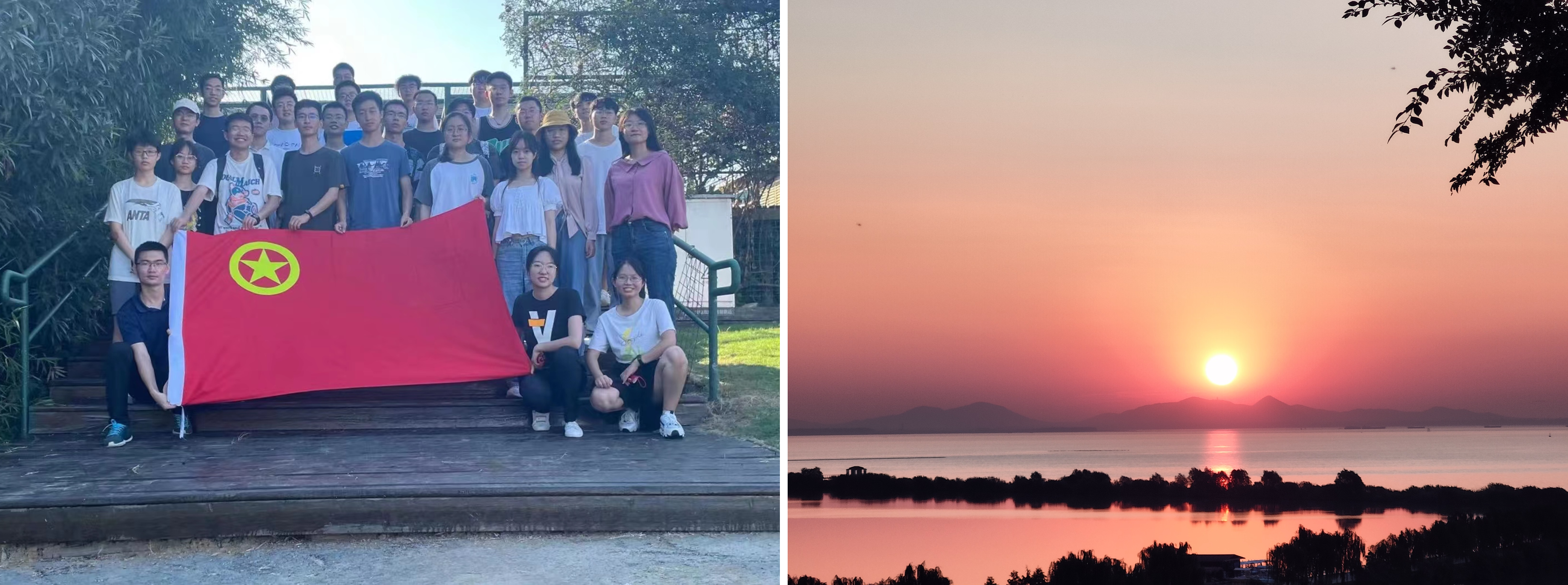 次日清晨,小伙伴们早早地起床,等待日出。远处湖面倒映着天空,随着日出的即将到来不断变化着,先是鲜艳的橙红色,再是浅黄色,又是浅红至湛蓝的渐变色。6时许,湖面上的薄雾渐渐散去,晨风徐徐吹来,大幕即将打开。太阳自湖对岸的山上探出头来,送来第一缕阳光,同学们感受着朝阳撒在身上的温暖,也融入了美好的大自然中。