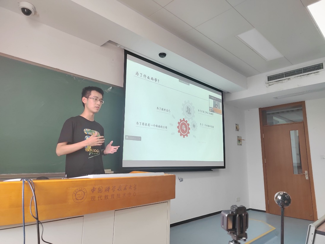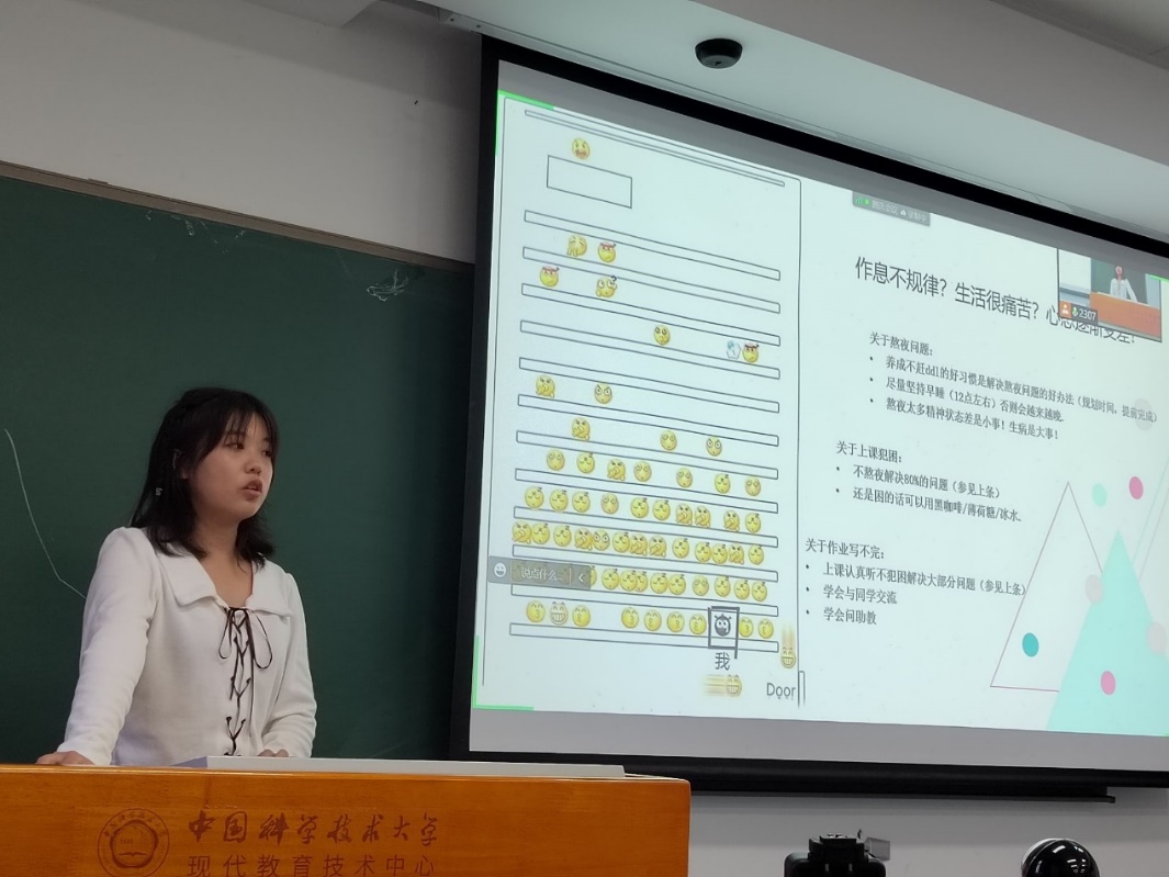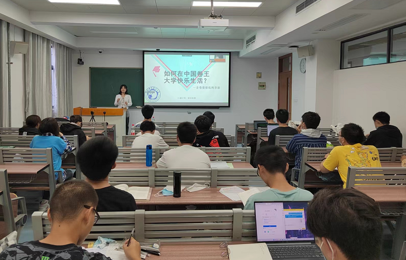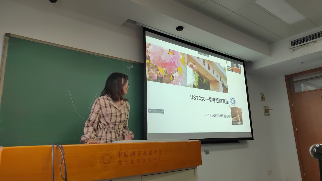 来自1班的汪冰倩学姐给同学们带来了“含卷量极低纯享版”的“中国卷王大学快乐生存指南”。她幽默风趣地和同学们分享了她的大一生活,和同学们“狠狠共情”,指出了科大学生的焦虑原因,鼓励同学们打破焦虑,发展兴趣,快乐学习。