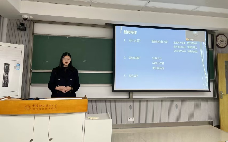 朱子月从新闻传播、新闻工作的角度专业地分析了新闻稿写作的目的、特点、格式和各部分写作方法,并引用中国科大新闻网上优秀新闻稿范例,深入浅出地讲解了新闻稿撰写经验、方法和技巧,给同学们提出了具体可行的写作方案,并鼓励同学们多写多练,不断取得进步。