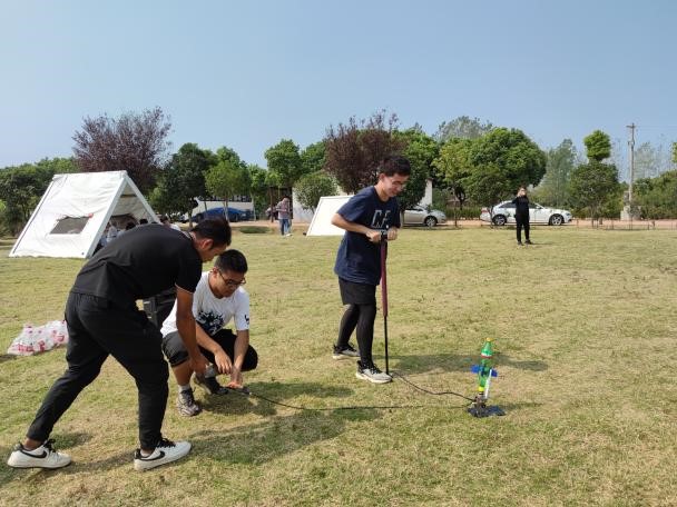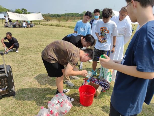 紧接着,同学们在工作人员指导下开始制作“航天水火箭”——通过对几个塑料瓶的剪切使用,装入水,在气筒注气中随着气压升上天空。该项目极大地锻炼了同学们的动手能力,参与积极性很高。