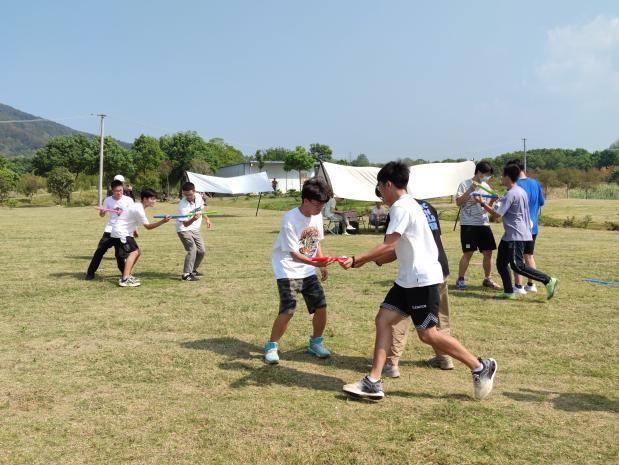 第二项,“三人接力运球”项目。每个帐篷出3名同学,每人均持一管,协力将小球运至终点。大家积极参与,很快打成一片,场面好不热闹。