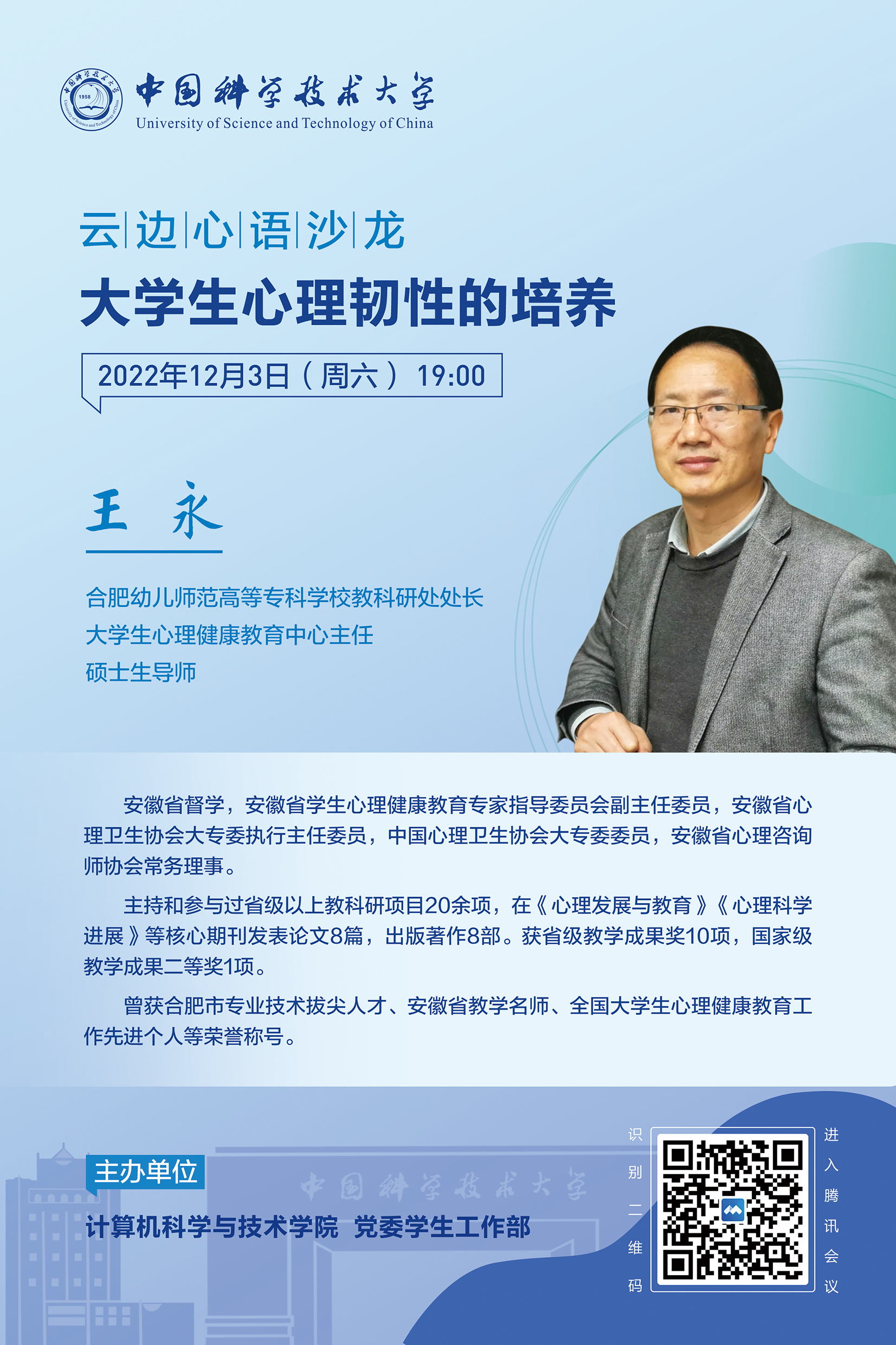 为了缓解疫情给在校大学生带来的各种负面影响,强化大学生直面疫情的积极应对的精神面貌,12月3日,beat365体育官方网站、党委学生工作部以线上直播的方式共同组织“云边心语沙龙——大学生心理韧性的培养”专场报告会,邀请合肥幼儿师范高等专科学校王永老师作专题报告,旨在帮助大学生认识和强化自身的心理韧性,短则为抵抗疫情,长则为持久性地提升自我。beat365体育官方网站及工程科学学院的上百名师生参加了本次活动,beat365体育官方网站党委副书记宫晓梅聆听了报告。报告会由beat365体育官方网站分团委副书记陈晓雅主持。